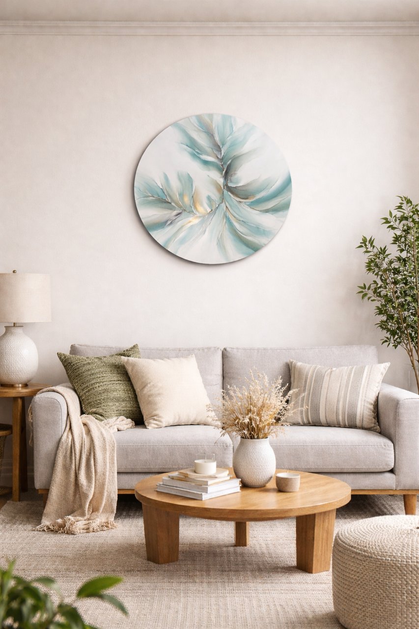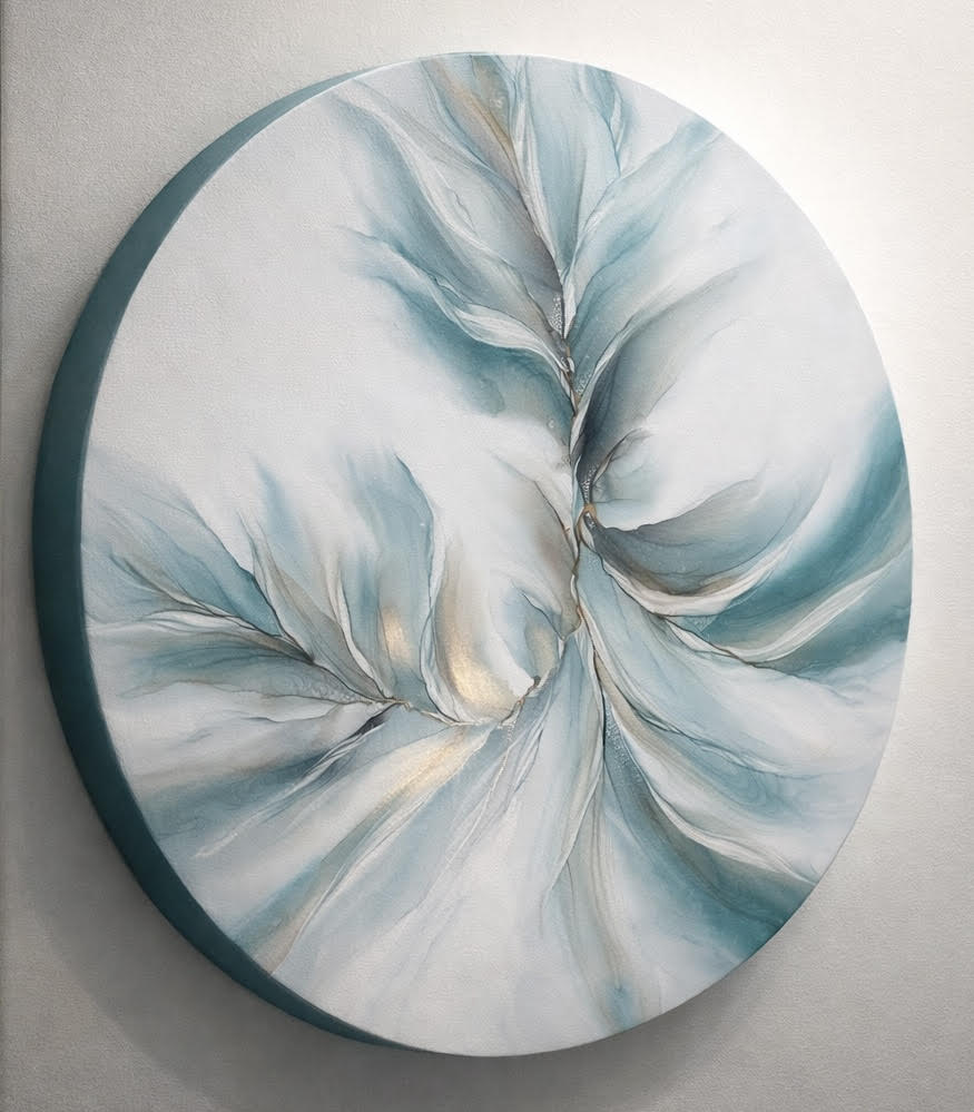 Original abstract alcohol ink on synthetic paper mounted to 75 cm (30”) round wood panel . Finished with varnish and UV protectant. Ready to hang